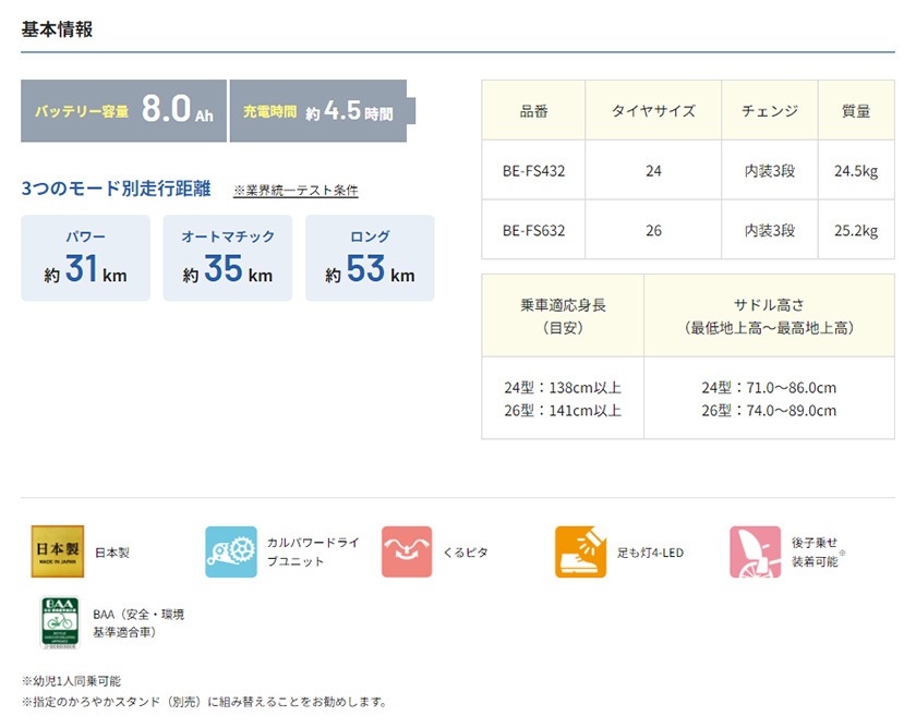 | 走行距離 | パワーモード:約31km オートマチックモード:約35km エコモード:約53km |