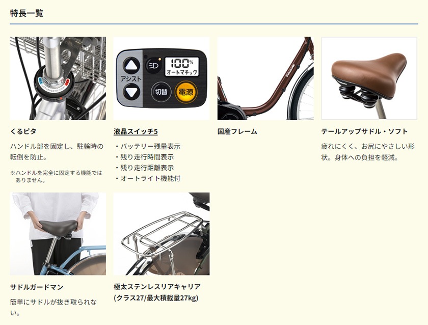 | 充電1回の走行距離(標準パターン) | 31km※(アシストモード:「パワー」使用時) |