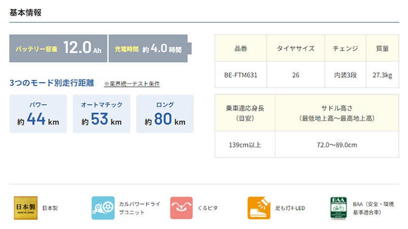 | 走行距離 | パワーモード:約44km オートマチックモード:約53km ロングモード:約80km |
