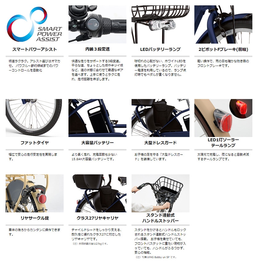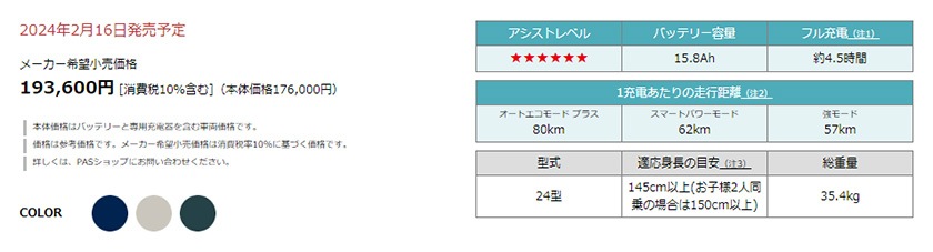 | 走行距離 | オートエコモードプラス:約80km スマートパワーモード:約62km 強モード:約57km |