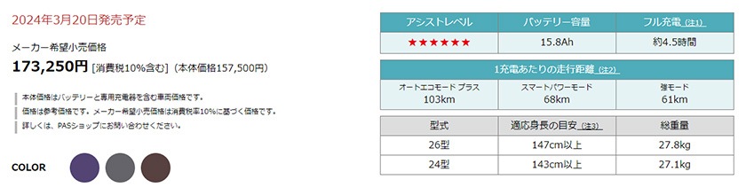 | 走行距離 | オートエコモードプラス:約103km スマートパワーモード:約68km 強モード:約61km |