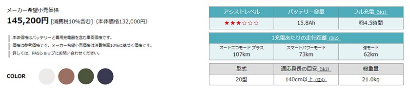 | 走行距離 | オートエコモードプラス:約107km スマートパワーモード:約73km 強モード:約62km |
