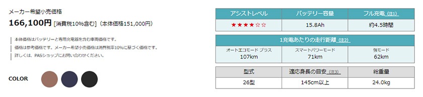 | 走行距離 | オートエコモードプラス:約107km スマートパワーモード:約71km 強モード:約62km |