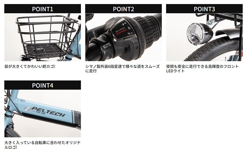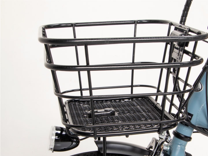 お買い物や通勤通学にも便利な前カゴ、駐輪時の施錠が容易な後輪錠、フロントLEDライト、シマノ製外装6段変速を装備。