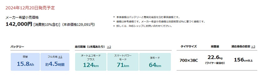 | 走行距離 | オートエコモードプラス:約124km スマートパワーモード:約71km 強モード:約64km |