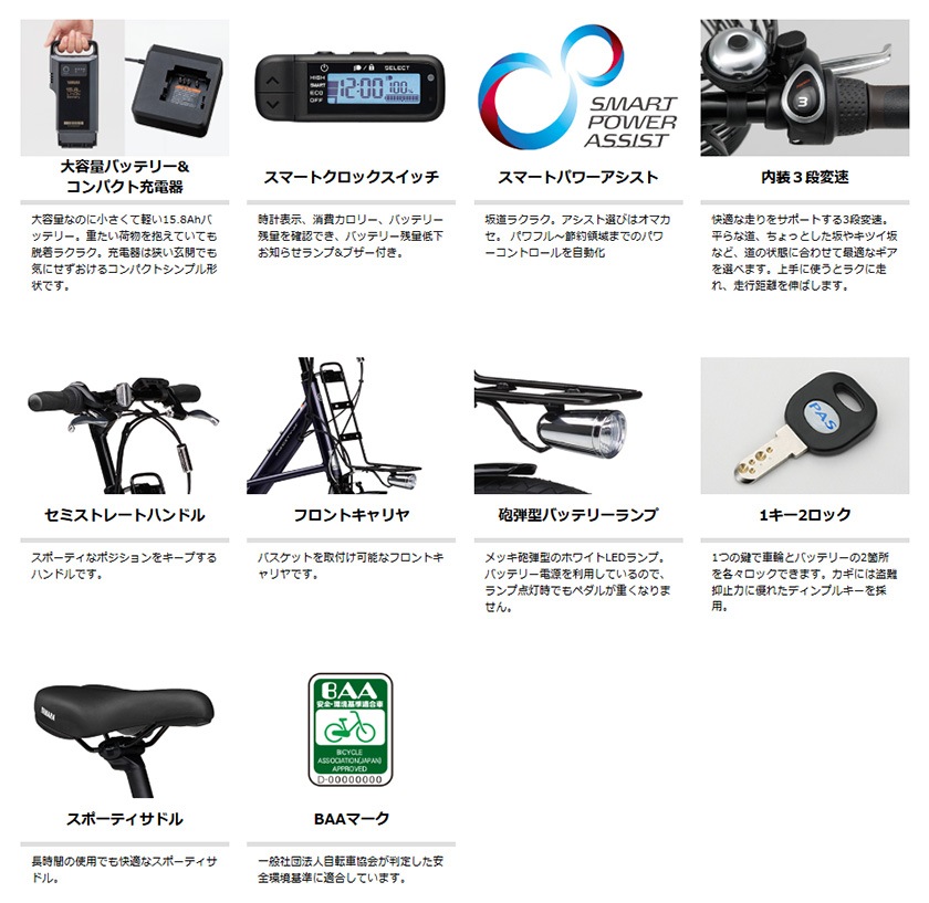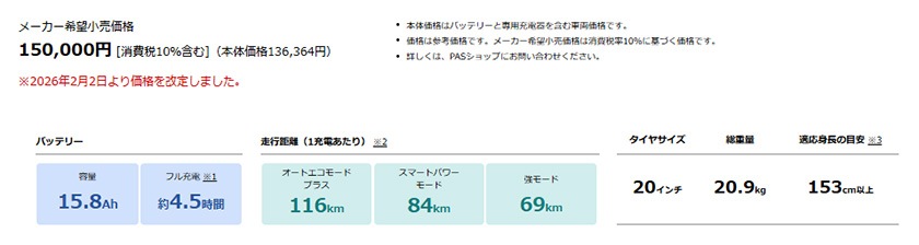 | 走行距離 | オートエコモードプラス:約116km スマートパワーモード:約84km 強モード:約69km |