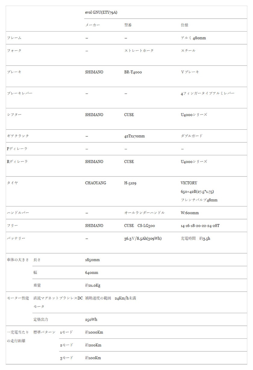 新設計のアルミフレームに回生充電効率を極限まで高めた太陽誘電製のアシストユニット「FEREMO」を採用し、1回の充電で1000kmを超える「ヌー」のような長距離移動を可能にしたEバイク(充電アシスト自転車)という事で「evol GNU」と名付けました。