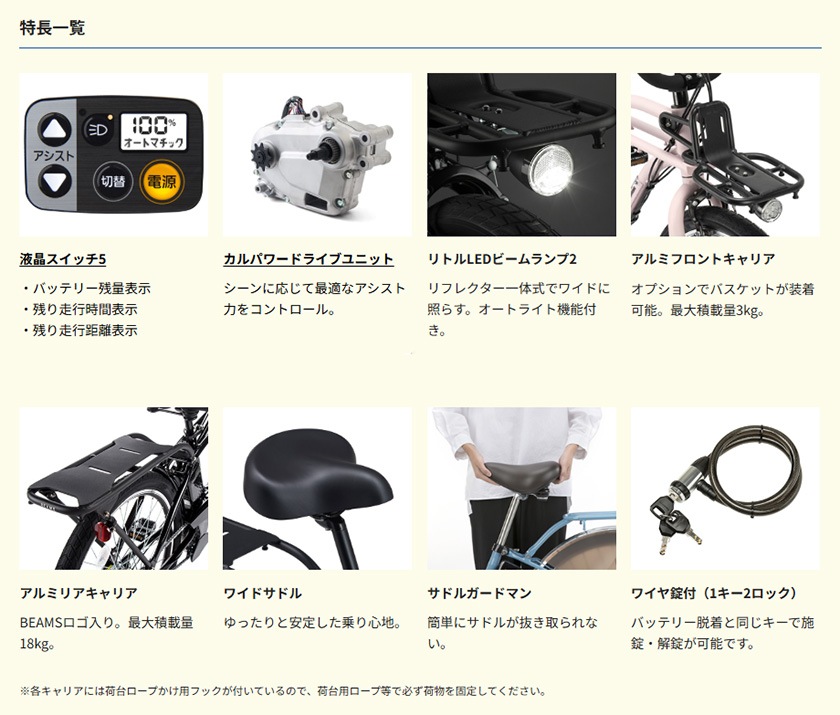 リアキャリアには「BEAMS」のロゴが入っており、最大積載量は18kgと実用的です。