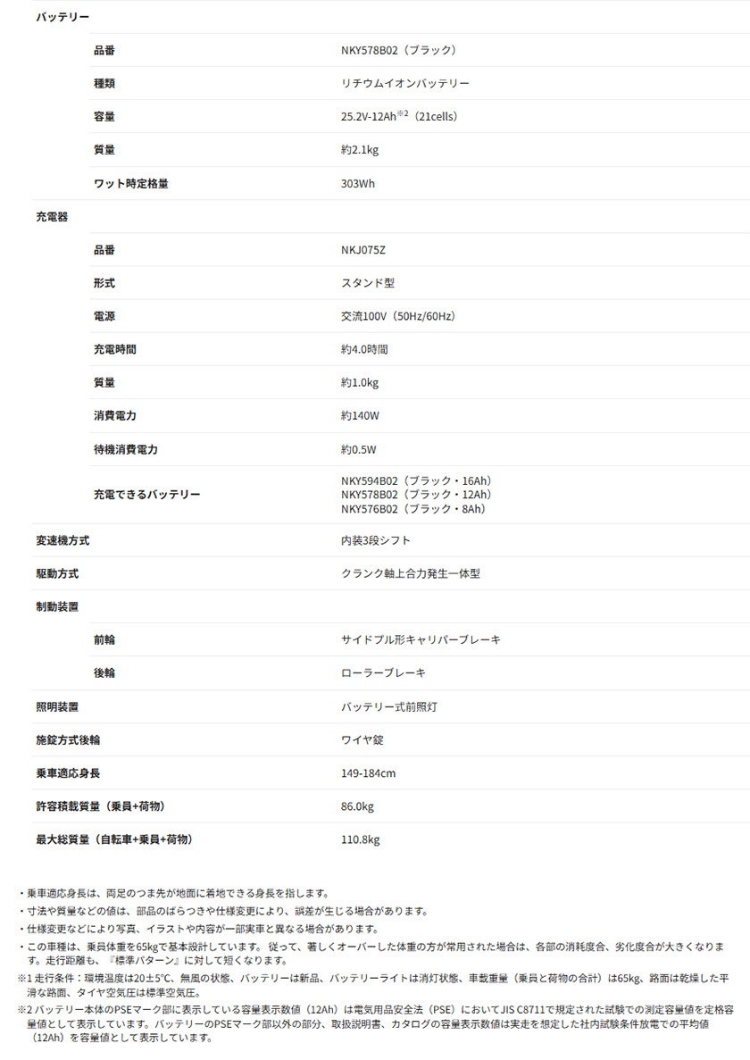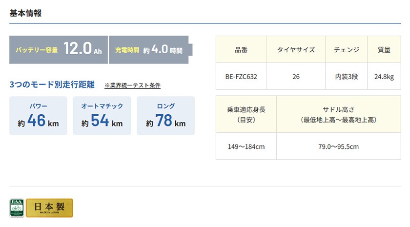 | 走行距離 | パワーモード:約46km オートマチックモード:約54km ロングモード:約78km |