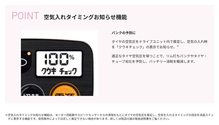 タイヤの空気圧をドライブユニット内で推定し、空気の入れ時を「クウキチェック」の表示でお知らせ。