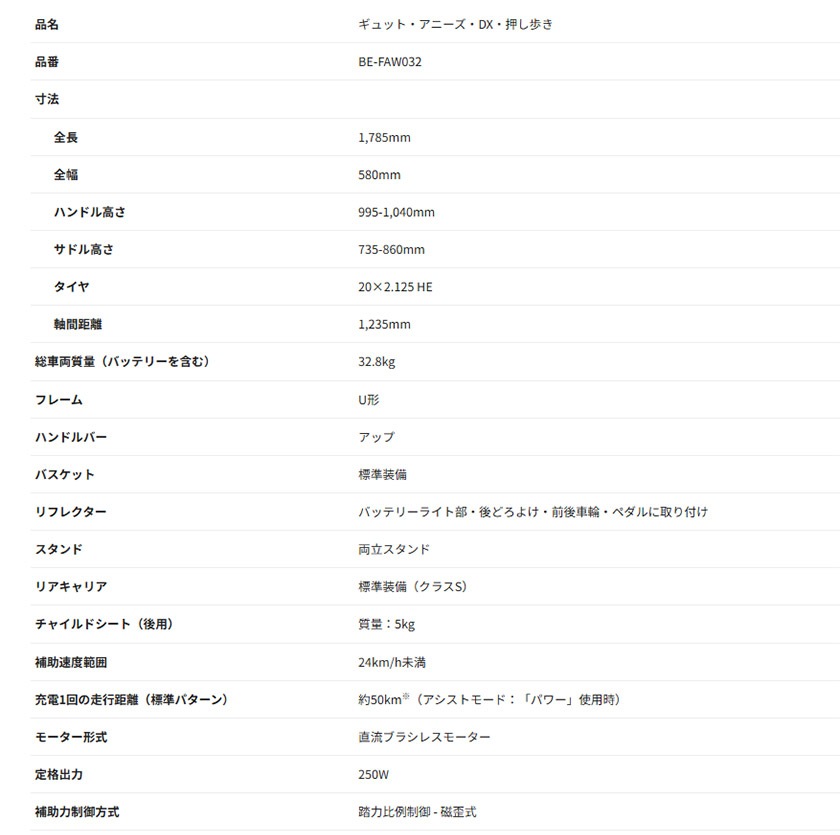 | 最大総質量(自転車+乗員+荷物) | 132.0kg |