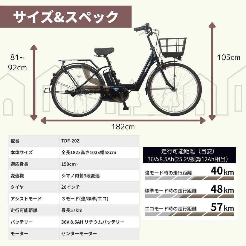 | 走行距離 | エコモード時最長57km (メーカー指定走行パターンに基づく) |